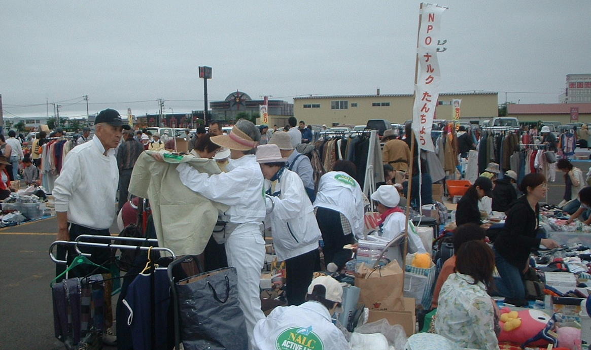 釧路 大フリーマーケット ![]() 7月16日、釧路で一番大きなフリーマーケットに初めての参加=写真。 心配した天気もまずまずで、洋服、着物、什器類、小物などを並べ、値札をつけ終わった頃に、周囲の約300の露天も準備完了していた。午前9時の花火の合図で営業開始。寒さのためか、午前中は秋物洋服や紳士物、什器類、小物が飛ぶように売れたが、午後から暑くなると夏物がどんどん売れた。気温の変化によって売れ筋の違いがはっきりわかる一日であった。おかげで売上は54,060円。露天用地代を引いても52,000円余りの収入を上げることができた。 |