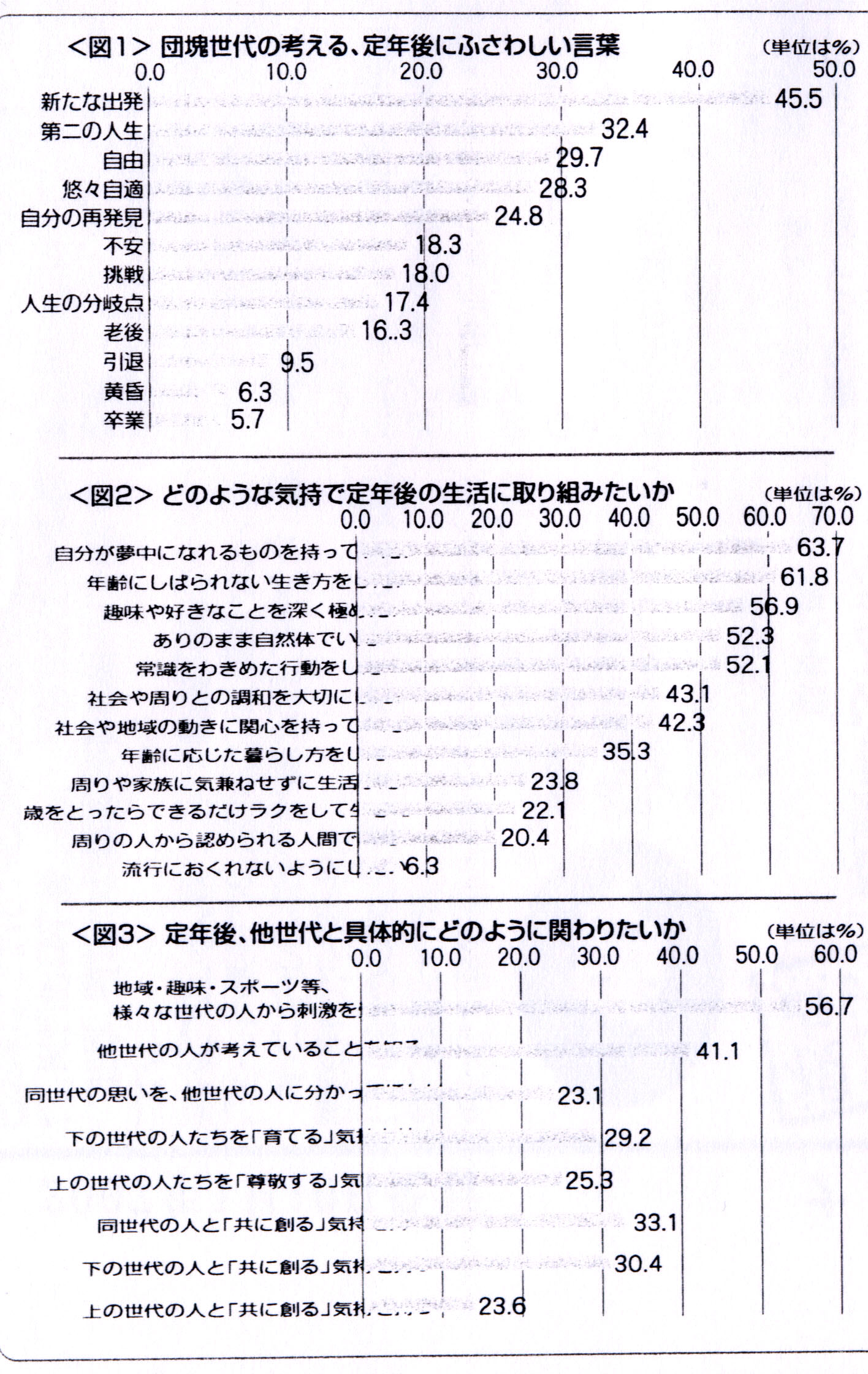 | 知ッ得 団塊世代のライフスタイル ナルクは2004年に大規模な「団塊世代の意識調査」を行った。その中で明らかになったことは「定年後は時間にとらわれず働き、趣味とボランティアに時間をさきたい」という彼らの意識だった。博報堂エルダービジネス推進室が同社の調査パネルを使って、同じようなテーマを少し違った角度から捉えているので紹介したい。(白石勝也) 1定年を表す言葉は「新たな出発」 団塊世代に「あなたの定年にふさわしい言葉は何ですか」と質問したところ、従来から言われてきた「第2の人生」を抜いて「新たな出発」が1位となった。そのほか「自由」「自分の再発見」など定年後も前向きに活力をもって生きようという意欲的言葉が上位にきている。 老後、引退、黄昏、卒業など「余生」をイメージする言葉は下位になった(図1) 2定年後の男のロマン 定年前後で団塊男性のアイデンティティを比較すると、定年前は「職業人としての自分」が圧倒的であったのに対し、定年後には「男としての自分」「夫としての自分」の数値が大幅に伸びている。目指すライフスタイルは、「年齢に縛られない生き方」「夢中になれる物をもちたい」などである。 どのような気持ちで定年後の生活に取り組みたいかを聞いたところ「男のロマン」や「男らしさ」を追求する答えが多かった。 反面「年齢に応じた暮らし方をしたい」や「年をとったらできるだけラクをして生きたい」といった静かに、ひっそりと余生を送る気持ちは薄いようだ(図2)。 3他世代との関わり 定年後どのような世代と付き合いたいかを聞いたところ「年代にこだわらず色々な人と知り合いたい」という人が67%で第1位であった。「同世代の人たちだけと気兼ねなく付き合いたい」は40%で「年下の人と親しくなりたい」より下回った。 具体的にどのように関わりたいかを聞いたところ「地域・趣味・スポーツなどを通じて色々な刺激を受けたい」という答えが一番多かった(図3)。 ![]() |