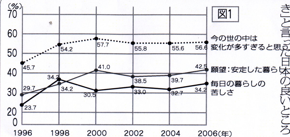 | @変化の多すぎる社会 余裕のない毎日 今の世の中は変化が多すぎる」という答えは10年前が45・7%であったものが2年後の1998年に8・5%程上がっています。それ以後は横ばいで2006年も56・6%程です。 安定した暮らしを望む声は10年前の29・7%から昨年の42・5%まで、ほぼ直線で伸びています。「毎日の暮らしの苦しさ」は初年度の23・7が直ぐ36・7に跳ね上がり、その後少し持ち直し昨年の34・2に続いています。(図1) ![]() |