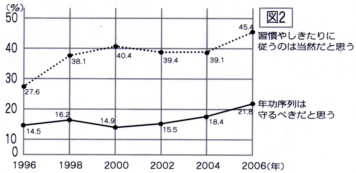 | A習慣しきたりには従い 年功序列は守るべきだ 構造改革の荒波をくぐり抜けてきたためか「習慣やしきたりに従う」「年功序列は守るべき」と言った日本の良いところを見直そうという意見が増えています。「習慣やしきたりに従う」は10年前が27・6%でしたが昨年は45・4%と17・8%の伸びです。 「年功序列は守るべきだ」は調査初年度の14・5%が10年間でゆっくりと21・8%まで伸びました。 (図2) ![]() ![]() |