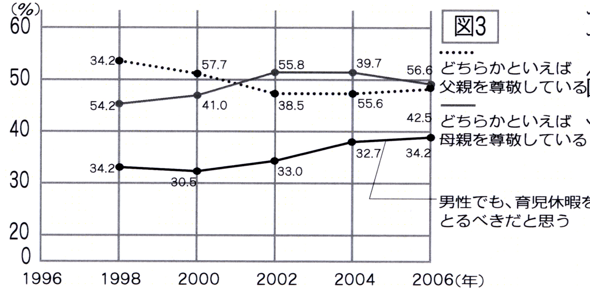 | B父母同権 夫婦で育児 「社会全般で男女平等が進展した」と答える人が増えています。 「どちらかといえば父親を尊敬している」と答えた人が1998年では53・7%で「母親を尊敬している」との答えより7・3%上回っていましたが、2001年に拮抗し、そこから5年ほど逆転現象を起こしています。しかしまた2006年で両者49%代で並びました。これは何を物語っているのでしょう。 「男性でも育児休暇をとるべきだ」という意見は、調査を始めた1998年が33・3%でしたが、それからじわじわ増え始めて、昨年は39%になっています。これがピークなのか、横ばいで推移するのか要注目です。(図3) ![]() |