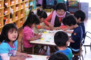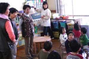 子育て支援として月1回、午前9時30分より11時迄の1時間30分保育所を、訪問しています。先生方の指導に沿った補助的なお手伝いです。 着替えの手助けや、絵本読み、所庭でのボール遊びや、ごっこ遊びです。また夏は水遊び、お天気の良い日はお散歩の付添等々,子供達との遊びと心の触れ合いを通して世代間の交流をさせて頂き,私達も共に癒されています。 活動が終わった後の皆さんの顔は満足に満ち溢れています。 ナルク寝屋川拠点 かづきの会 担当 岩花 溢子
