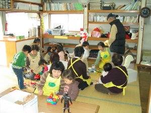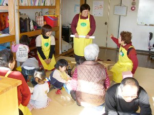 平成25年 1月11日6名参加、2〜3歳児15名を。5月20日8名参加、2〜3歳児8名を無邪気なに遊ぶ子どもたち、「おじいちゃん、誰のおじいちゃんなの?」と問いかける無邪気な声、真剣な視線。楽しい一日でした。