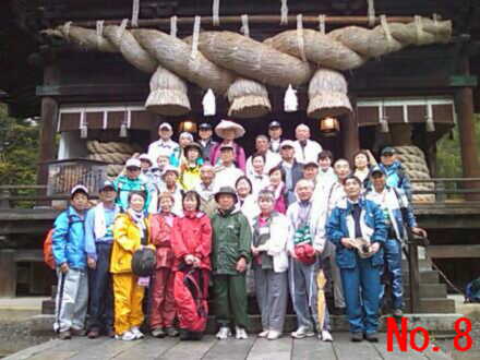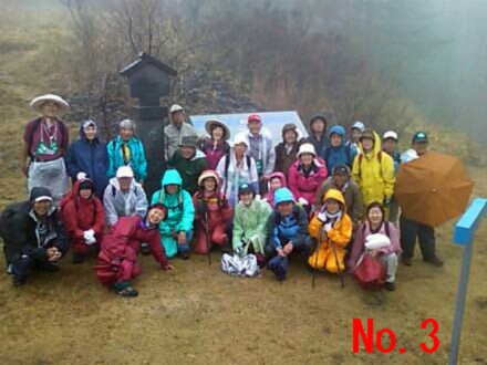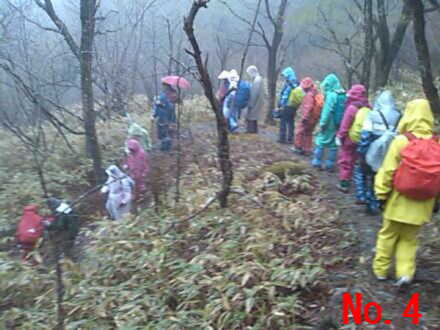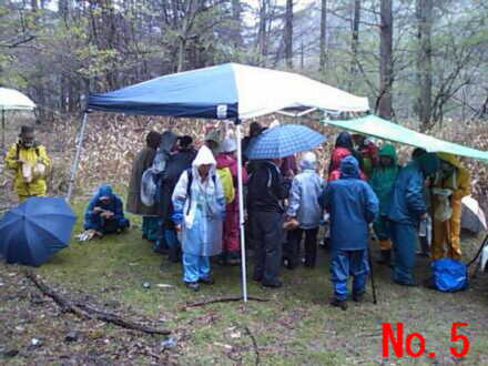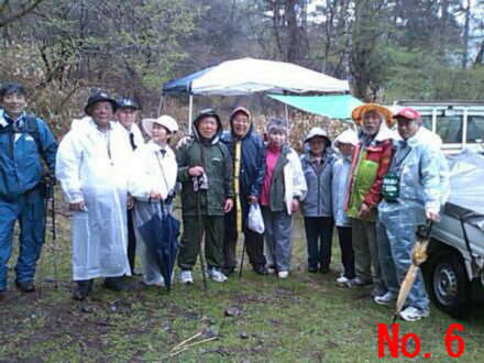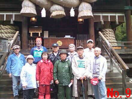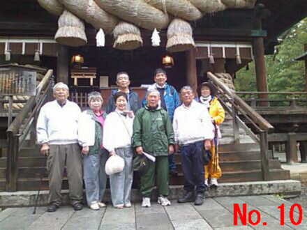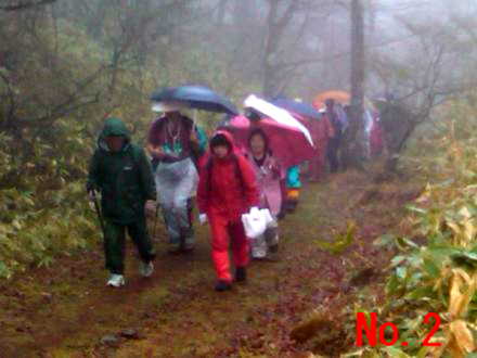 | <写真説明> No.1 雨の中旧道を行く雨カッパの一行 No.2 標高があがるにつれ強い雨足と霧の中を峠目指して歩く No.3 標高約1600mの和田峠頂上にて記念撮影 No.4 厳しい急な坂路を下る一行 No.5 雨の中テントの中で昼食をとる No.6 雨の中テントを張り昼食の準備をして頂いた。上田千曲拠点の皆さん有り難う No.7 諏訪大社の御柱木落とし坂に到着 No.8 今日の終点諏訪大社にて記念撮影 No.9 4日間案内やら接待して頂いた、みよた拠点の皆さん有り難う No.10 みよた拠点と一緒にご案内やら準備を懸命にやって頂いた。上田千曲拠点の皆さん有り難う |