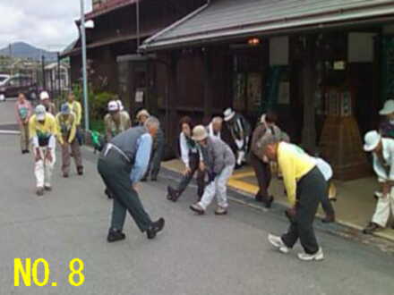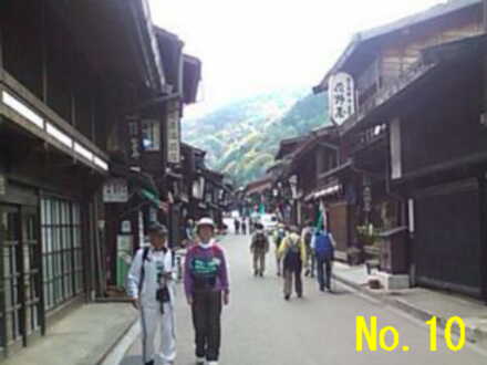 | No.1 朝のミーティングと新参加の方々の紹介 No.2 本山宿の宿場風景を見ながら歩く No.3 本山宿の一里塚跡、江戸より61里、京へ71里の表示あり No.4 これより南木曽路の碑の前で記念撮影 No.5 山が迫る深い谷あいを行く一行 No.6 平沢地区の漆工芸かねみつでサラサドウダンツツジを植樹する(かねみつの社長と高畑会長) No.7 漆器の町平沢歩く No.8 奈良井駅に到着し拠点の指導で整理体操 No.9 奈良井宿に到着し全員の記念撮影 No.10 奈良井の宿場を今日の宿に向かう |