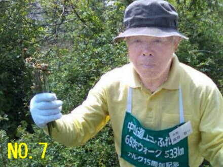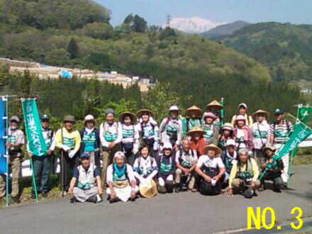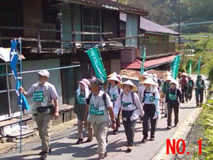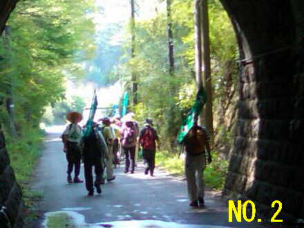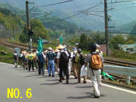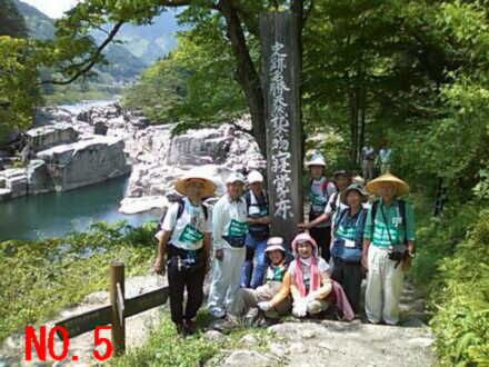 | No.1 朝から暑い木曽福島の町外れを歩く一行 No.2 狭いトンネルを抜けて新緑の森の中へ No.3 歩き初めて一時間の小休止、後ろの雪の山は木曽の御嶽山 No.4 寝覚の床での昼食風景、メインディッシュは蕎麦の実入りおじや No.5 寝覚の床を谷底まで下りた、元気集団の中の超元気者達 No.6 ウグイスの声に励まされながら、JR中央西線の線路に沿って歩く No.7 一休み中も一人元気にワラビ取りに熱中する会長 No.8 小さな峠で一休み No.9 気温31℃の国道で水分補給する一行 No.10 須原宿に到着、江戸より京都の方がずっと近くなりました |