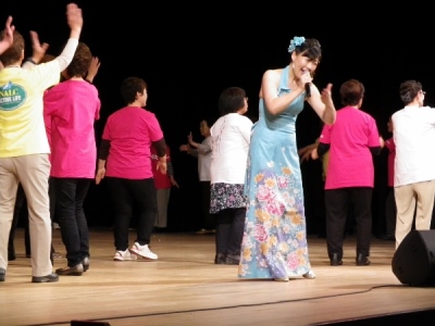 | 歌手 高橋樺子さんの歌に 合わせて仮設住宅からの 招待者会場が一つになった |
