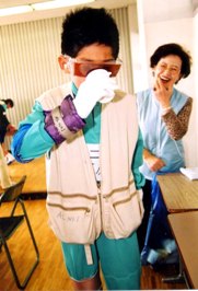 高音カットの耳栓や白内障眼鏡、手足のサポーターと重り更に荷重チョッキを装着して、高齢者になった時の肉体的機能低下や心理的変化を疑似的に体験し、高齢者にやさしい心や介護・介助の手法、バリヤフリーの環境、社会つくりに役立てることを目的としています。